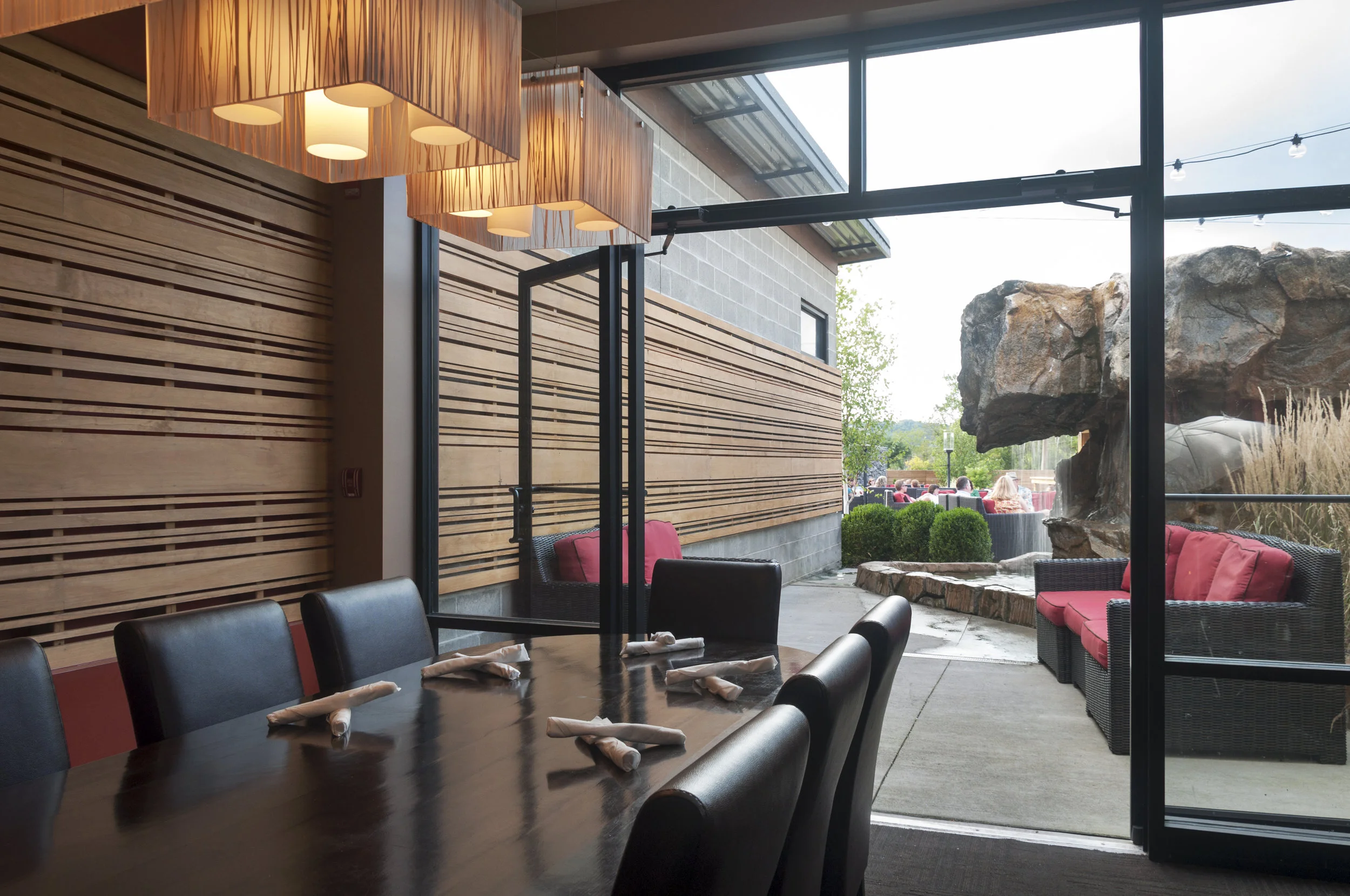 We designed Rumfish Grille as a prototype restaurant with an outside garden bar. The floor plan is set on axis with the setting sun to create an interior orientation and connection to the exterior bar. A concrete wall serves as a signature element that transects inside and outside spaces. This project won an AIA Pittsburgh Design Award in 2014.